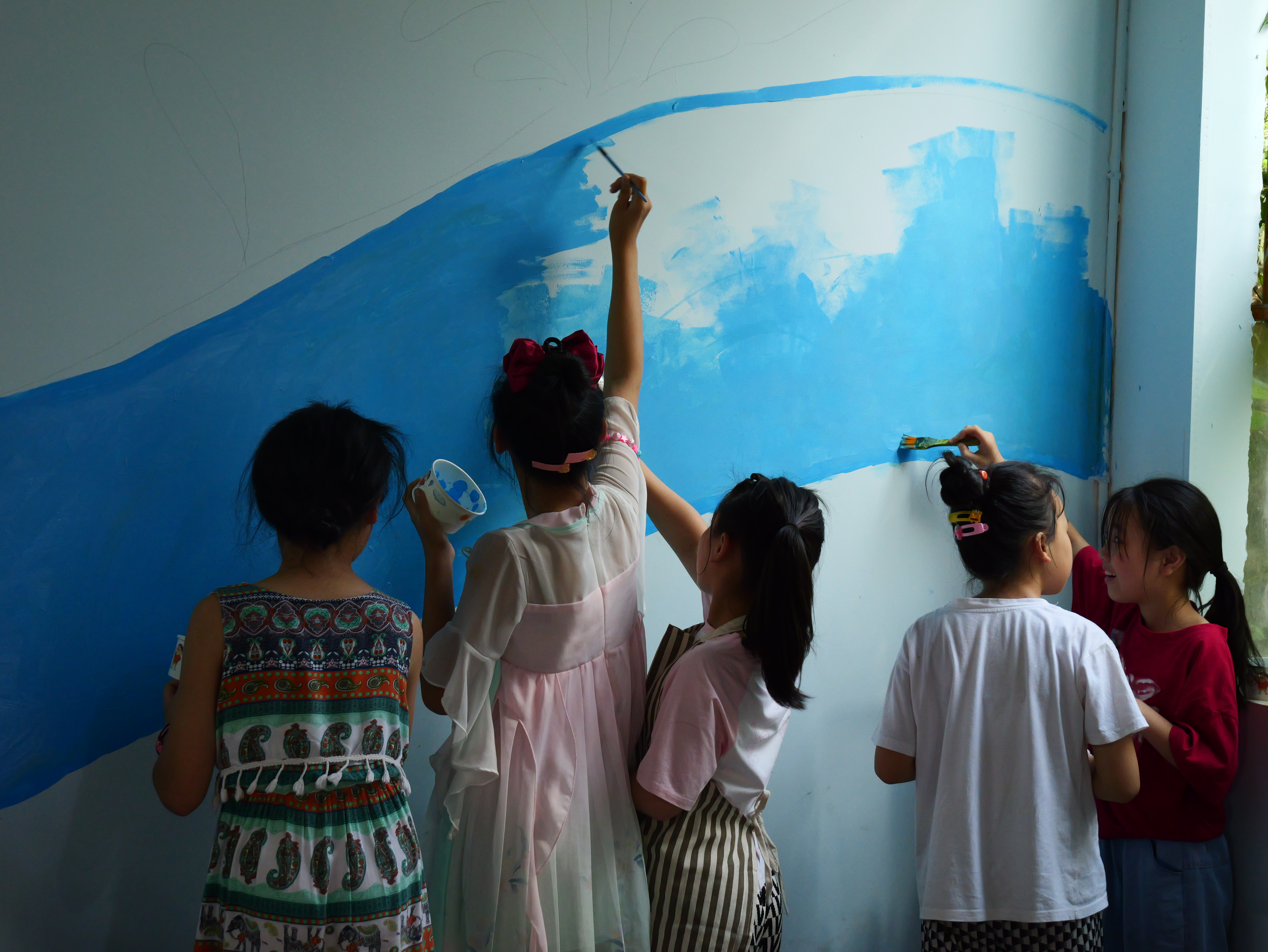 我们在重庆开州天和镇上建立了一间图书室,在800 平方、10 个房间的空间中完成了实地考察、室内翻新、空间设计、墙绘与书架安装等工作。我们募资与整理书籍,让翻新后的图书室成为孩子们触摸世界的小小入口。